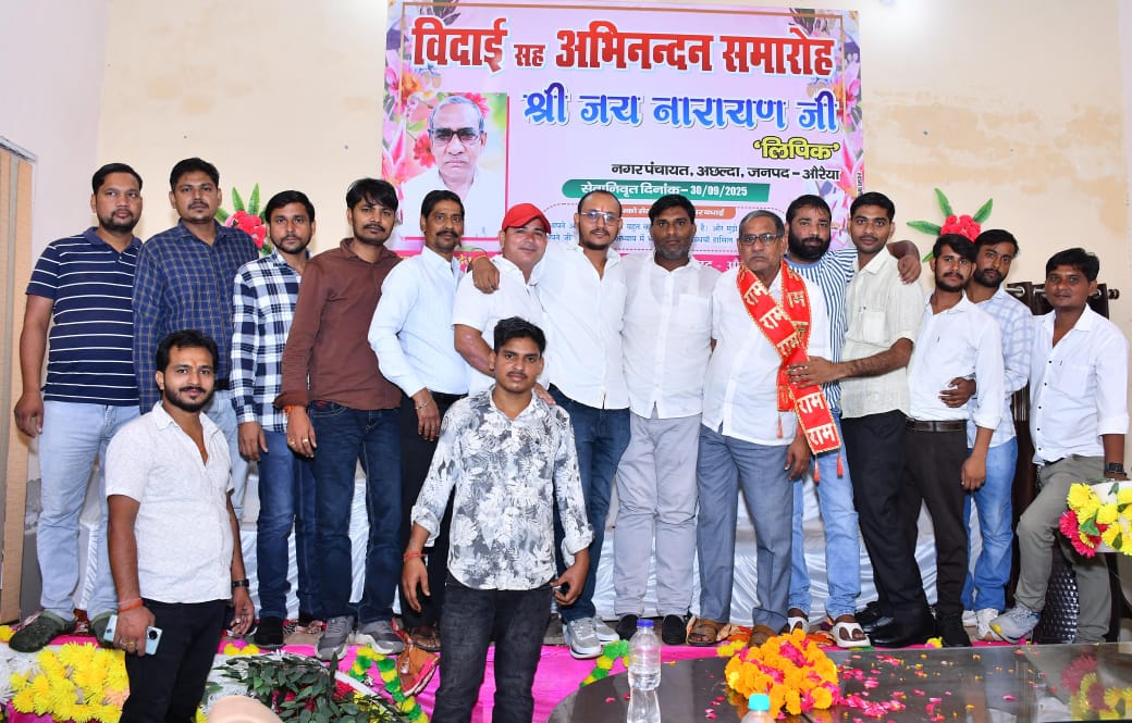 औरैया,संवाददाता:नगर पंचायत अछल्दा के सभागार में वरिष्ठ लिपिक जय नारायण शाक्य विदाई समारोह चला।नगर पंचायत अध्यक्ष अरूण कुमार दुबे रिंटू और ब्लाक प्रमुख शरद सिंह राना और अधिशाषी अधिकारी विनय पांडेय आदि ने पगड़ी पहनाकर प्रतीक चिन्ह देकर सम्मान किया।सभागार खचाखच भरा था।